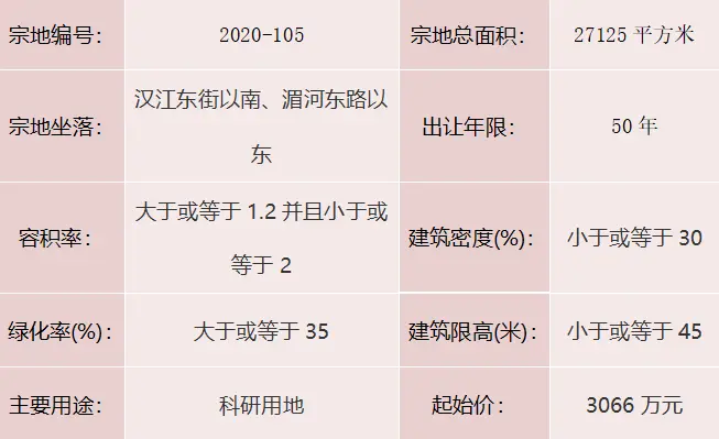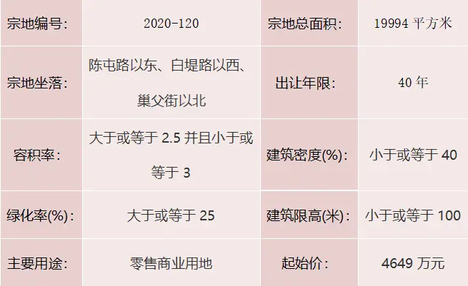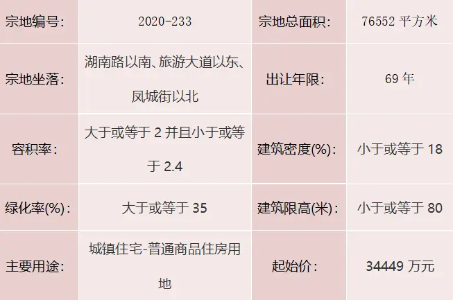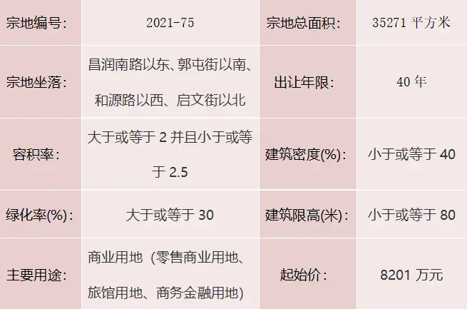 6、该地块规划土地总面积为77413平方米,本次先行出让面积为76552平方米,出让起始价为34449万元(300万元/亩);待861平方米的收回完成后,以协议方式按照300万元/亩的价格出让于地块竞得人。