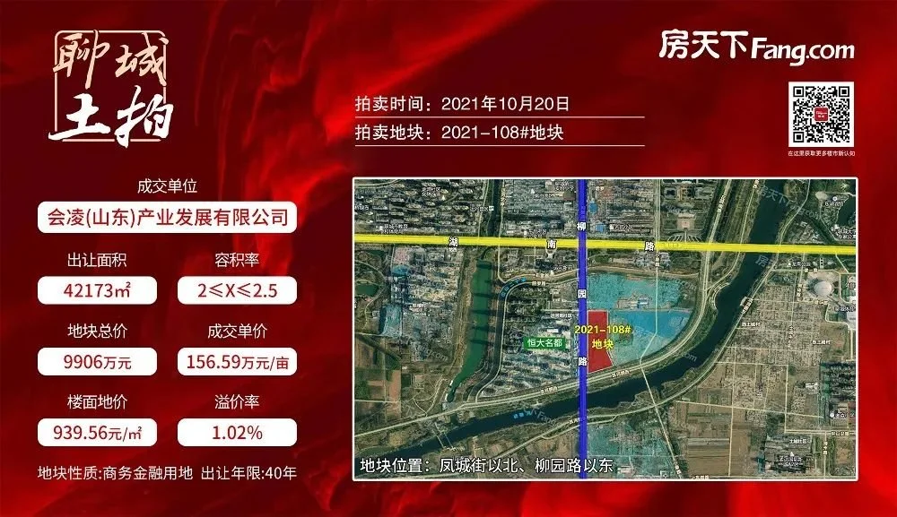 2021-108#为商务金融用地,共有2家房企参与,历经3轮出价后由会凌(山东)产业发展有限公司竞得,成交总价为9906万元,成交单价约合156.59万元/亩,成交约合939.56元/㎡,为1.02%。