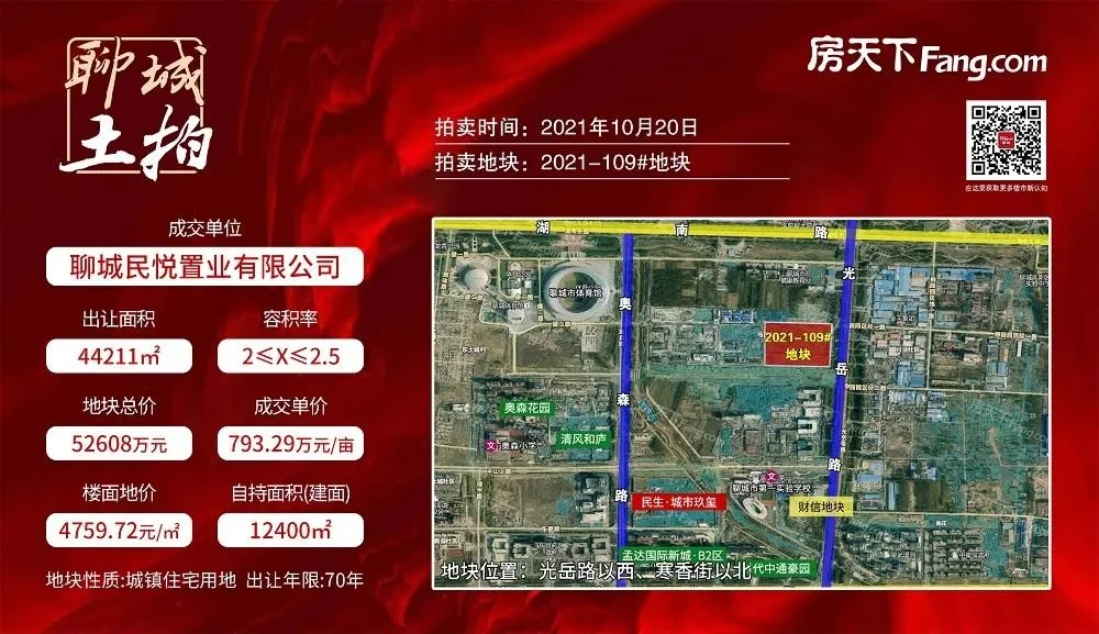 其中2021-109#住宅备受关注,在出让条件中规定,竞价达到52608万元时,转入竞自持面积用于长期住房,在历经65轮激烈竞拍后达到限价,从而转入竞自持阶段,最终聊城民悦置业有限公司凭借自持面积12400㎡摘得该。成交总价为52608万元,成交单价约合793.29万元/亩,成交约合4759.72元/㎡,自持比例约为11.22%。