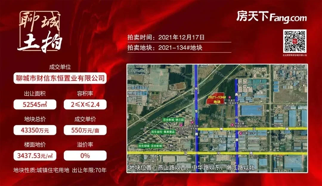 12月17日,前期中止出让的开发区2在官方网站集中竞拍。最终2021-134#地块为聊城市财信东恒置业有限公司以底价43350万元摘得;2021-135#因无人出价流拍。具体土拍内容如下: