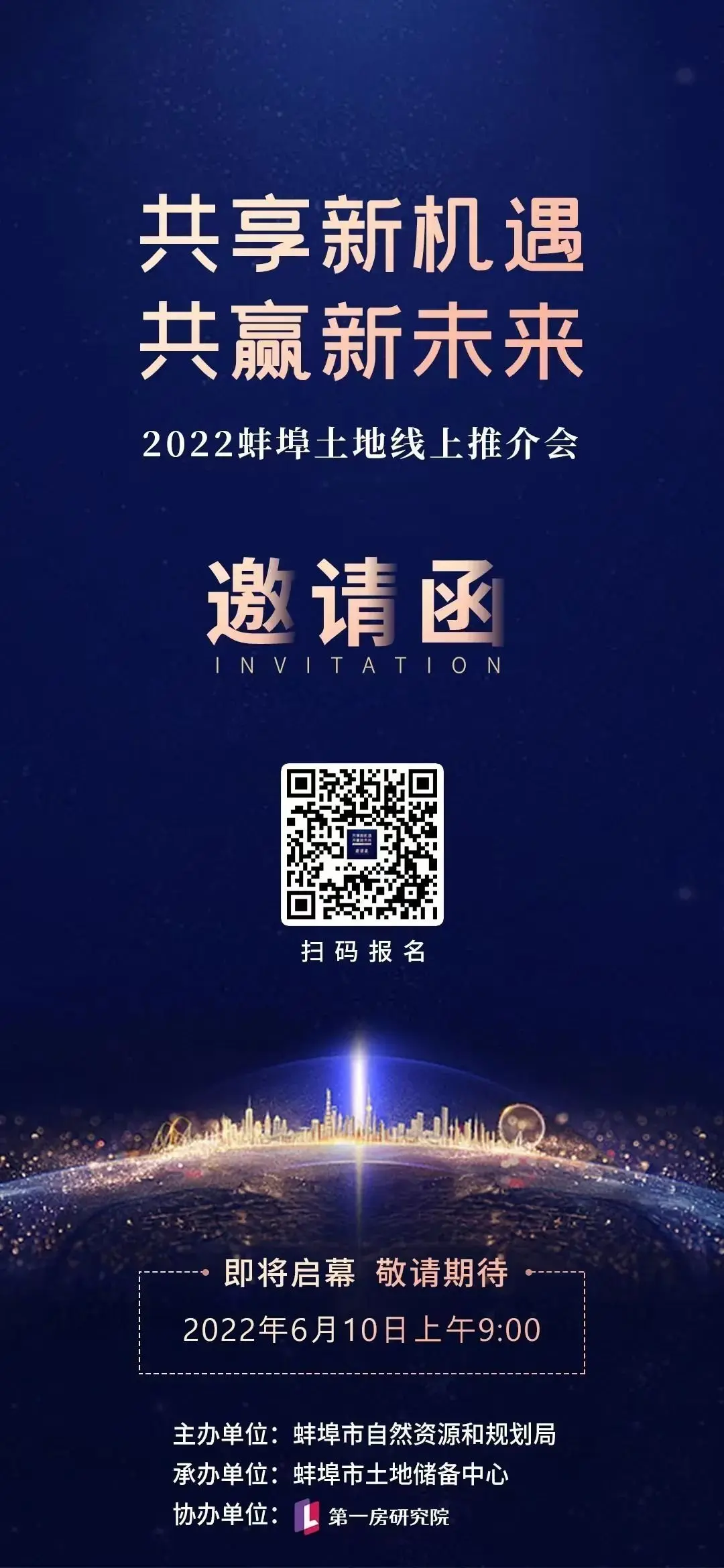 6月10日上午9点,由蚌埠市自然资源和规划局主办、蚌埠市中心协办、第一房研究院承办的“共享新机遇,共赢新未来”2022蚌埠土地线上推介会将隆重举行,推介会将通过第一房抖音号、视频号等平台同步直播。