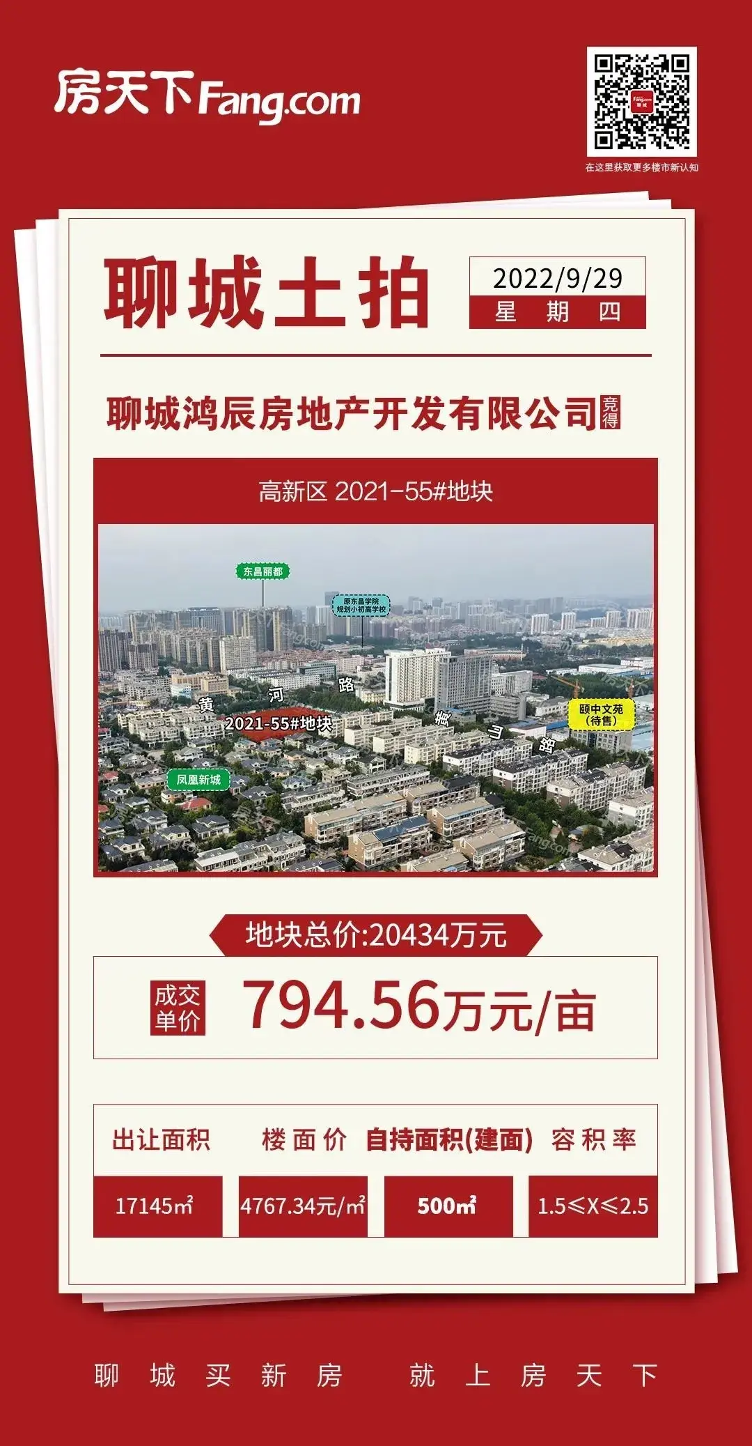 9月29日,高新区2021-55#集中竞拍,共有10家房企参与,历经62轮出价,最终由聊城鸿辰有限公司竞得,成交总价为20434万元,自持面积()为500㎡,成交单价为794.56万元/亩,约合4767.34元/㎡。
