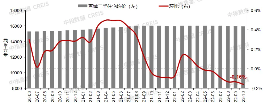 中指研究院报道:根据中国房地产指数系统百城价格指数对全国100个城市新建、二手住宅销售市场及50个城市的调查数据,2022年10月,百城新建住宅平格为16199元/平方米,环比下跌0.01%,已连续4个月环比下跌,跌幅较9月收窄0.01个百分点;同比上涨0.06%,涨幅较9月收窄0.09个百分点。