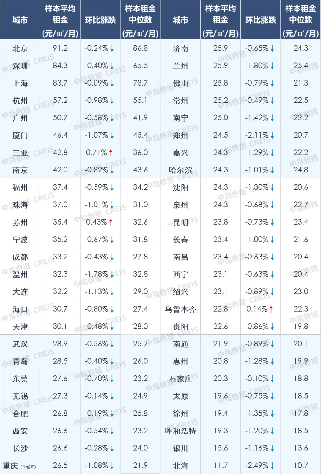 10月,全国50个平均为37.1元/平方米/月,环比下跌0.59%;同比下跌3.63%,跌幅较9月收窄0.37个百分点。