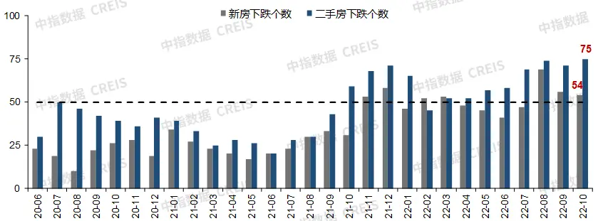 图:2020年6月至2022年10月百城新建及二手住宅价格环比下跌城市数量