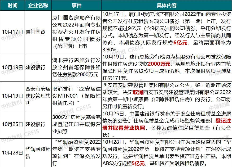 行业动态:建行拟设立的300亿基金完成备案,11月8日建行住房租赁基金正式发行。西安市安居建设管理集团取消2022年度第一期中期票据()发行。同时,多家企业如上海地产、国贸地产、微领地、金地商置、大华集团等,在上海有新品牌推出或有新的保租房项目开业或动工,昆明公司首个保租房品牌“惠青家”正式发布,深圳人才安居集团合作开发的4个保租房项目同时开工。