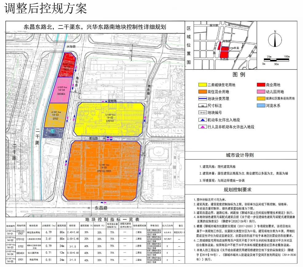 东昌东路北二干渠东兴华东路南位于东昌东路以北、二干渠以东、兴华东路以南;用地性质为、城镇社区服务设施用地、幼儿园用地、商业服务业设施用地和商住混合用地;规划用地面积约12.4公顷;商业服务业街区基准容积率不大于3.0,公共服务用地街区基准容积率不大于1.5,居住用地街区基准容积率不大于2.3,街区基准容积率不大于0.8。