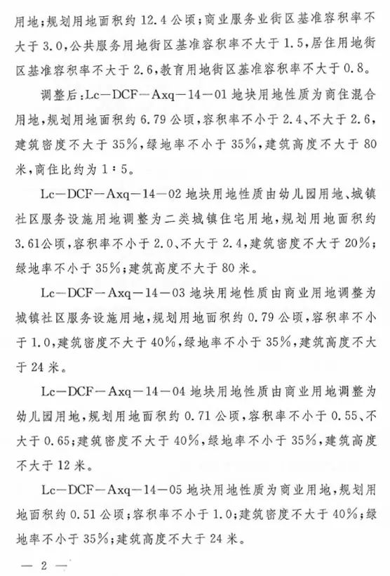 lc-dcf-axq-14-02用地性质由幼儿园用地、城镇社区服务设施用地调整为二类城镇,规划用地面积约3.61公顷,容积率不小于2.0、不大于2.4,不大于20%;不小于35%;建筑高度不大于80米。