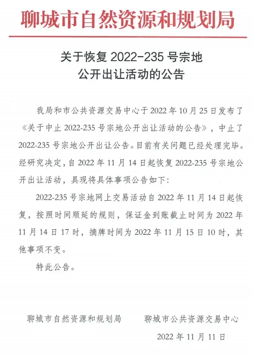我局和市于2022年10月25日发布了《关于中止2022-235号公开出让活动的公告》,中止了2022-235号宗地公开出让公告。目前有关问题已经处理完毕。经研究决定,自2022年11月14日起恢复2022-235号宗地公开出让活动,具现将具体事项公告如下: