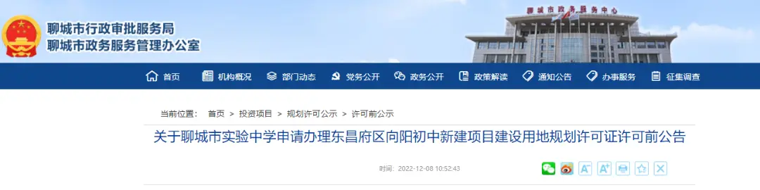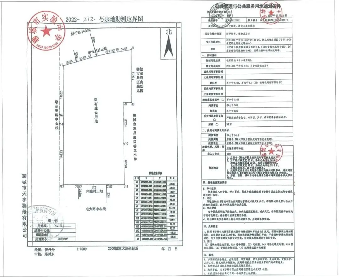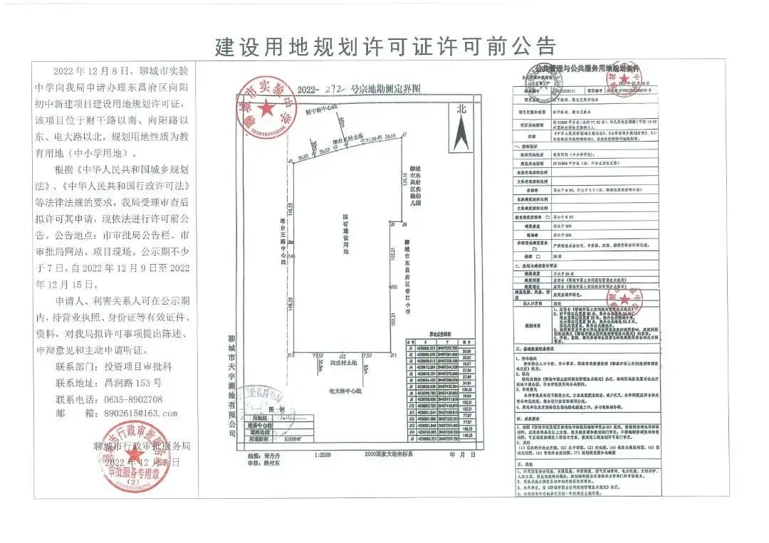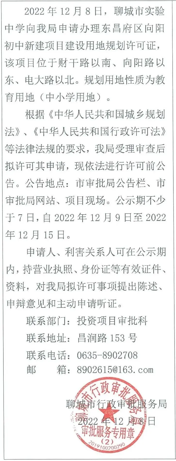 2022 年12月8日,聊城市实验中学向我局申请办理东昌府区向阳初中新建项目,该项目位于财干路以南、向阳路以东、电大路以北。规划用地性质为(中小学用地)。