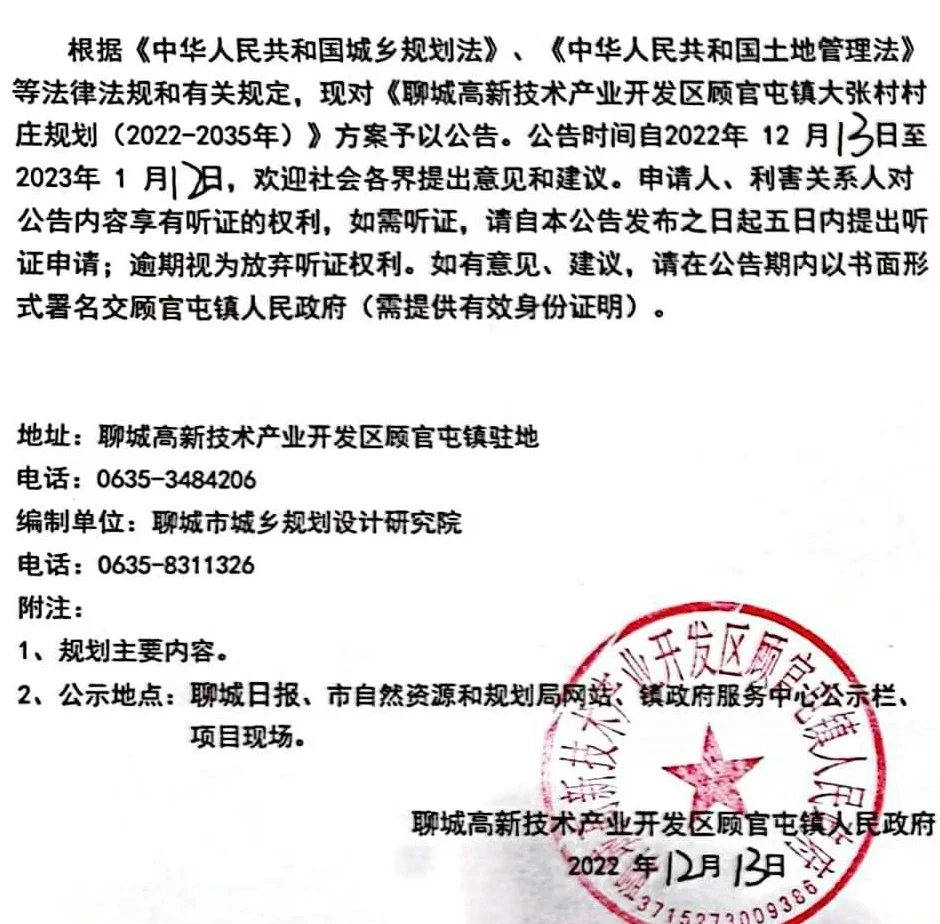 根据《中华人民共和国城乡规划法》《中华人民共和国土地管理法》等法律法规和有关规定,现对《聊城顾官屯镇大张村村庄规划(2022-2035年)》方案予以公告。公告时间自2022年12月13日至2023年1月12日,欢迎社会各界提出意见和建议。申请人、利害关系人对公告内容享有听证的权利,如需听证,请自本公告发布之日起五日内提出听证申请,视为放弃听证权利。如有意见、建议,请在公告期内以书面形式署名交顾官屯镇人民政府(需提供有效身份证明)。地址:聊城高新技术产业开发区顾官屯镇驻地电话:编制单位:聊城市城乡规划设计研究院电话:附注:1.规划主要内容。2.公示地点:聊城日报、市自然资源和规划局网站、镇政府服务中心及村委会公示栏、项目现场。聊城高新技术产业开发区顾官屯镇镇人民政府2022年12月13日