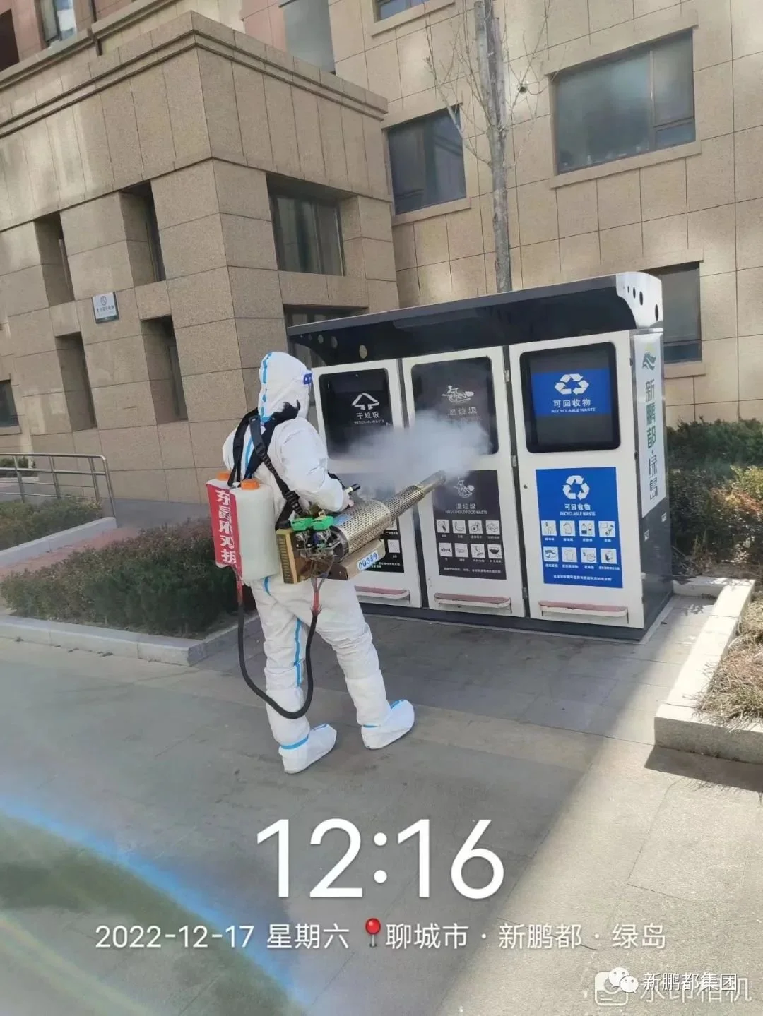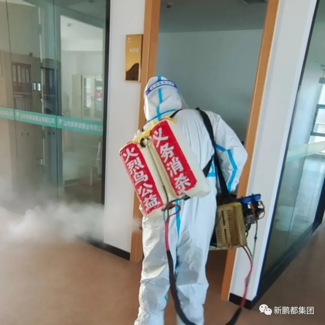 当日上午十点半后,聊城市公益组织人员身穿消杀防护服、手套、n95口罩和防疫面具,背着弥雾机和消毒水对、营销中心、地下停车场、所有公区开展全面消毒,不漏下任何死角。