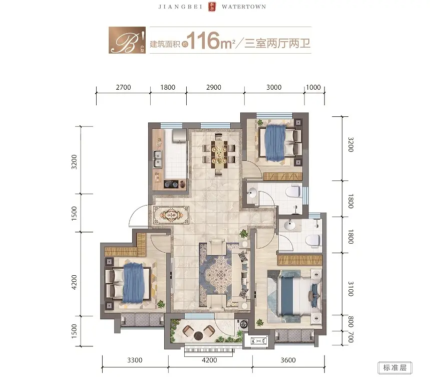 当代·江北水镇建面约116㎡的三室两厅两卫,用每一寸空间诠释美好时光,从居者的生活体验出发,不失品质的尊崇,也保留个性的本真。