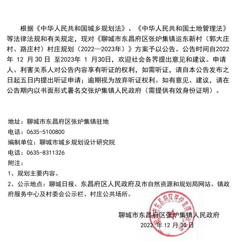 根据《中华人民共和国城乡规划法》《中华人民共和国土地管理法》等法律法规和有关规定,现对《聊城市东昌府区张炉集镇运东新村(郭大庄村、路庄村)村庄规划(2022-2035年)》方案予以公告。公告时间自2022年12月30日至2023年1月30日,欢迎社会各界提出意见和建议。申请人、利害关系人对公告内容享有听证的权利,如需听证,请自本公告发布之日起五日内提出听证申请,视为放弃听证权利。如有意见、建议,请在公告期内以书面形式署名交张炉集镇人民政府(需提供有效身份证明)。