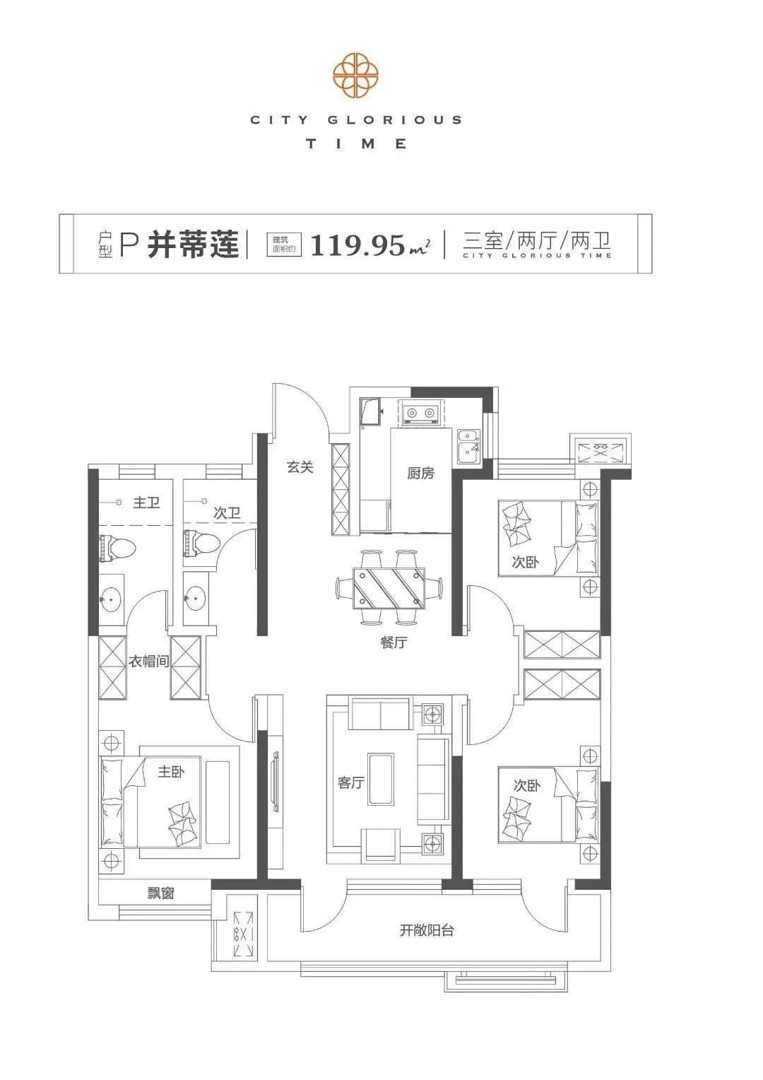建面约119.95㎡p户型-并蒂莲,灵动三起居,高效满足全家所需,解锁生活无限可能;宽敞客厅衔接餐厅连接阳台,延伸了视觉的通透性,为一家人带来更佳的人居生活舒适度,给人沉浸式的未来生活画面感;灵活多变的u型操作台,功能配置充足,动线无缝衔接,科学动线之下,中西餐美味同步,让下厨成为一种生活乐趣。