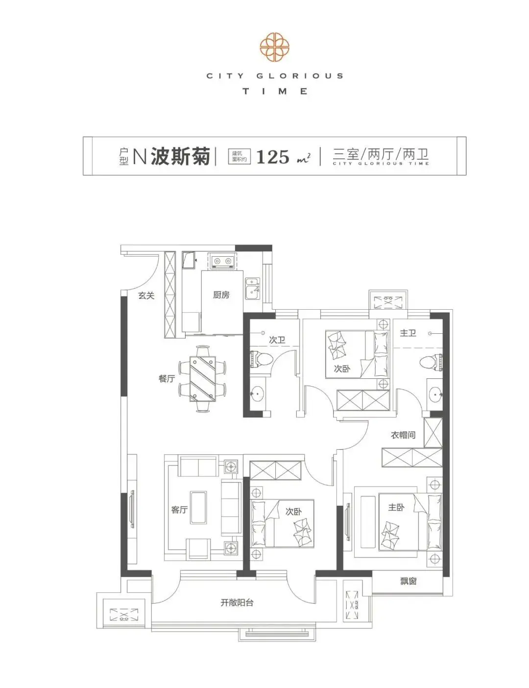 建面约125㎡n户型-,宽敞三室,动静分区,起居有序,进退有序;入户玄关,出门入户井然有序,超大收纳空间,让整理变得轻松,乐享整洁生活;主卧的进一步保护了主人的隐私,拥有了自己的一方天地,精致安放一天的疲惫;双联阳台,阳光于此流连,尺度间尽是对理想人居的完美追求。