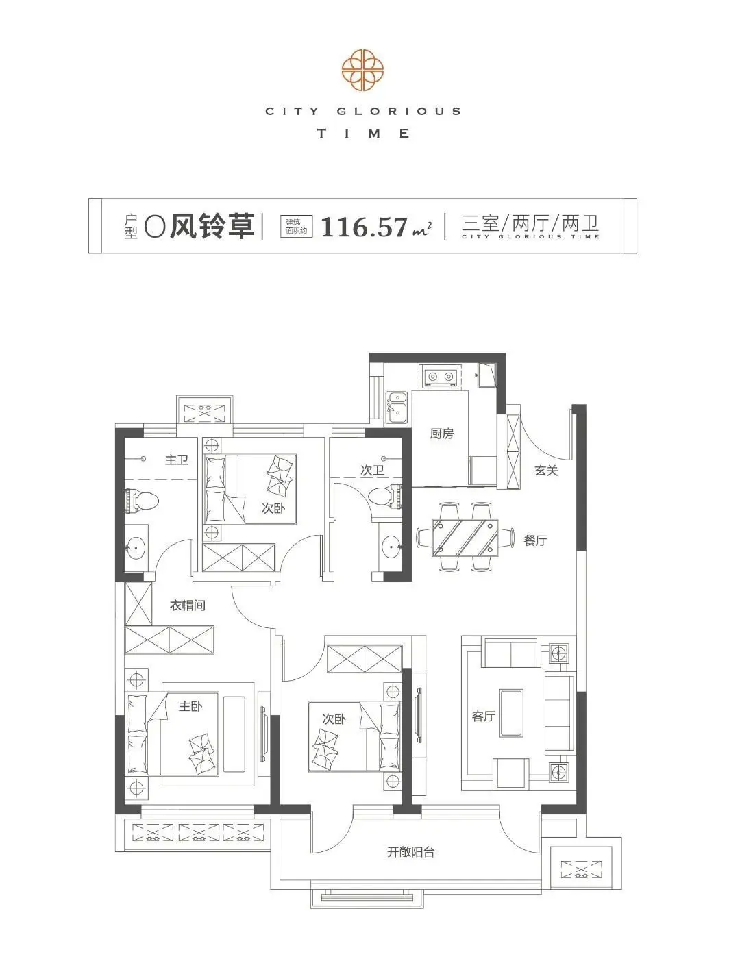 建面约116.57㎡o户型-风铃草,经典三面宽,细致考量生活一处场景,深藏对生活的美好想象,采光、通风俱佳,让清风自由穿梭,为每一户带来的阳光照耀,为室内营造明亮充足的采光效果;客厅连接双阳台,观园品茶,莳花赏月,给生活一份独有浪漫;u型厨房,动线,畅享每日烹饪甜蜜。