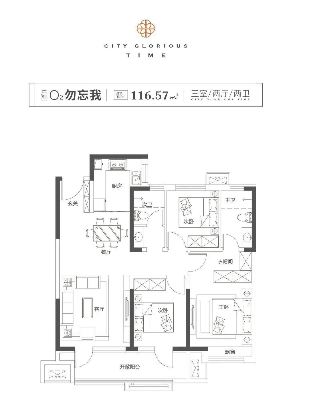 建面约116.57㎡o2户型-勿忘我,品质三房,容纳家人日常多元的生活方式;三面通透的,明媚阳光可在此尽情挥洒;阔尺的竖厅设计,客、餐厅与阳台空间整体连通的设计,令空气流通自如,在餐客厅区域也能舒享的清爽;主卧私藏独立,步入式衣帽间、,私密尊享,近揽奢居仪式。