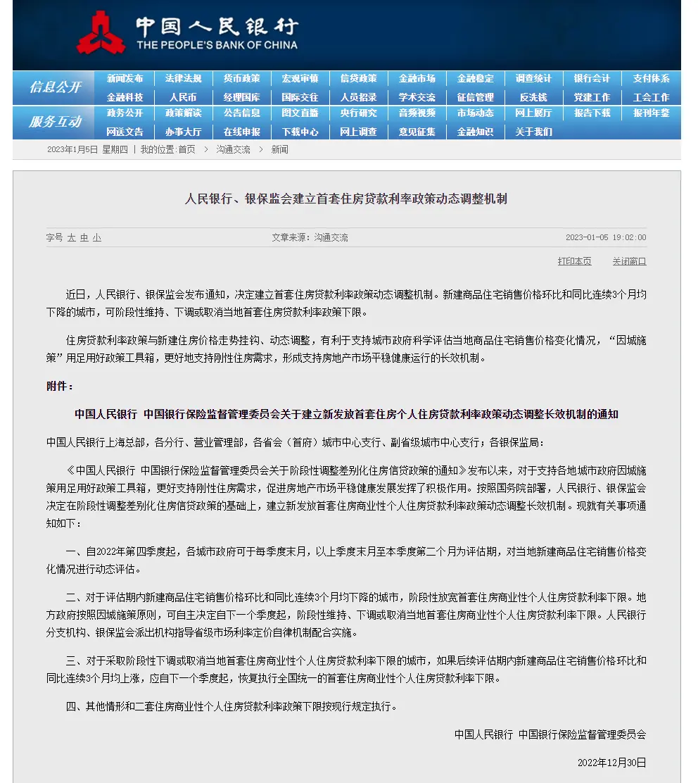《中国人民银行 中国银行保险监督管理委员会关于阶段性调整差别化住房政策的通知》发布以来,对于支持各地城市政府用足用好政策工具箱,更好支持刚性住房需求,促进平稳健康发展发挥了积极作用。按照国务院部署,人民银行、银保监会决定在阶段性调整差别化住房信贷政策的基础上,建立新发放首套住房性利率政策动态调整长效机制。现就有关事项通知如下: