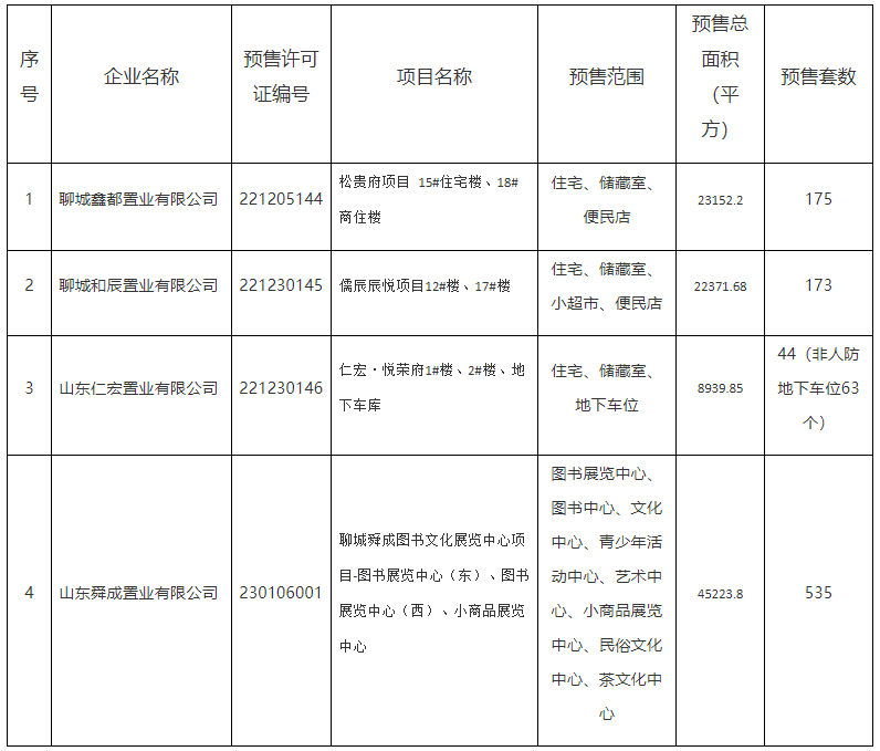 聊城舜成图书文化展览中心项目-图书展览中心(东)、图书展览中心(西)、小商品展览中心取得预售许可证,预售范围为图书展览中心、图书中心、文化中心、青少年活动中心、艺术中心、小商品展览中心、民俗文化中心、茶文化中心,为45223.8㎡,预售套数为535套。