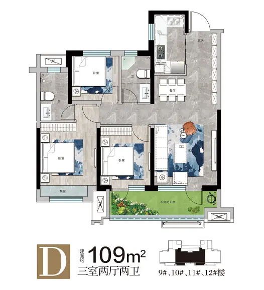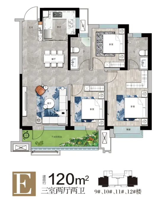 109㎡三室两厅两卫户型,匠心精研每一寸空间,是满足年轻一代家庭的舒适型户型,兼具舒适度与尺度。若是新婚两人,可以选一间作为客房,还剩一间带有设计阳光房作为多功能间;若是三代同堂,那么房间刚刚好,可以满足全生命家庭的居住需求。