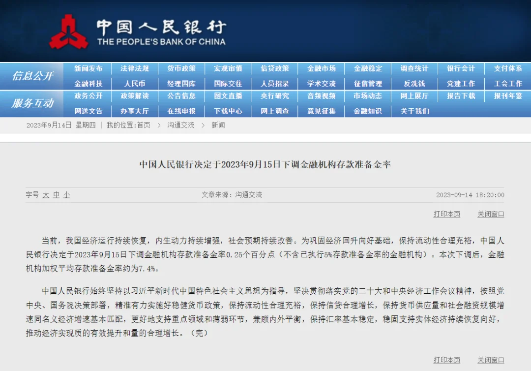 当前,我国经济运行持续恢复,内生动力持续增强,社会预期持续。为巩固经济回升向好基础,保持流动性合理充裕,中国人民银行决定于2023年9月15日下调金融机构0.25个百分点(不含已执行5%存款准备金率的金融机构)。本次下调后,金融机构加权平均存款准备金率约为7.4%。中国人民银行始终坚持以习近平新时代中国特色社会主义思想为指导,坚决贯彻落实党的二十大和中央经济工作会议精神,按照党中央、国务院决策部署,精准有力实施好稳健货币政策,保持流动性合理充裕,保持合理增长,保持货币供应量和社会融资规模增速同名义经济增速基本匹配,更好地支持重点领域和薄弱环节,兼顾内外平衡,保持汇率基本稳定,稳固支持实体经济持续恢复向好,推动经济实现质的有效提升和量的合理增长。