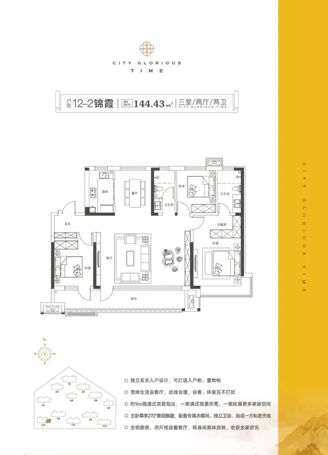 以144㎡三室空间为例,南向三面宽设计,约9m跑道式双联阳台,奢适面宽容纳广阔光景,以通透格局迎纳四季阳光、清风入怀,社区内叠境园景,透过主卧套间的270°景观倾泻而来,浅尝大自然馈赠给生活的诗意。