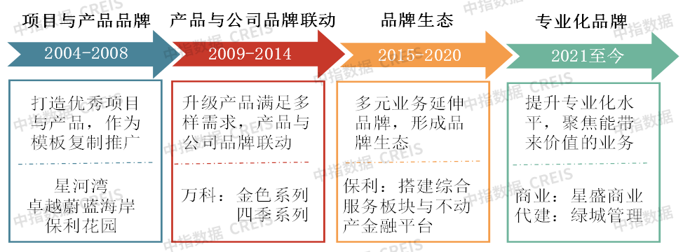 品牌企业跟随经济发展与需求,不断迭代与创新产品。品牌企业首先通过优秀项目打响品牌知名度,并通过复制实现规模化发展;伴随消费需求结构改变,品牌企业拓展住宅产品体系,逐步转向公司品牌和系列产品品牌;在升级住宅产品谱系的同时,品牌企业在多元业务中进行品牌延伸,形成品牌综合开发运营优势。据此,将二十年品牌体系的变迁划分为四个阶段:项目与产品阶段(2004-2008年)、产品与公司品牌联动阶段(2009-2014年)、品牌生态阶段(2015-2020年)与专业化品牌阶段(2021年至今)。