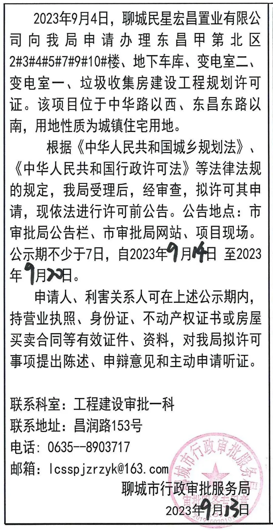 根据《中华人民共和国城乡规划法》《中华人民共和国行政许可法》等法律法规的规定,我局受理后,经审查,拟许可其申请,现依法进行许可前公告。公告地点:市审批局公告栏、市审批局网站、项目现场。公示期不少于7日,自2023年9月14日至2023年9月20日。