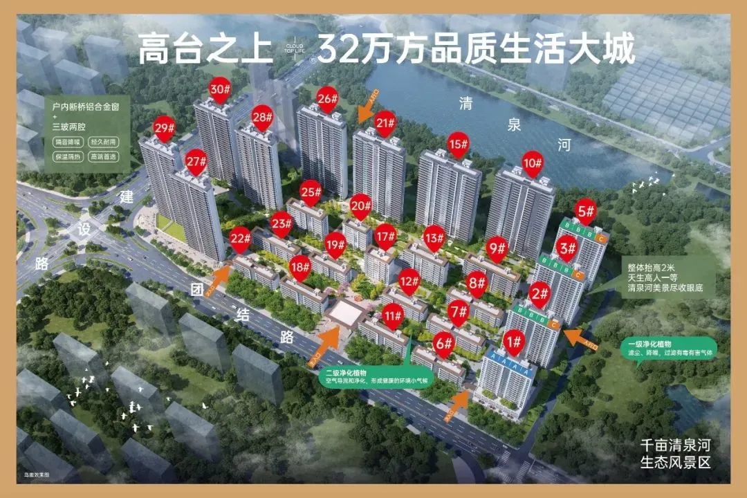 财信·云境坐揽冠县最为珍贵的自然景观资源——清泉河,拥揽千亩清泉河生态风景区,让广袤蓝天、碧波绿意成为窗前点缀,筑造一片城央水岸桃源。