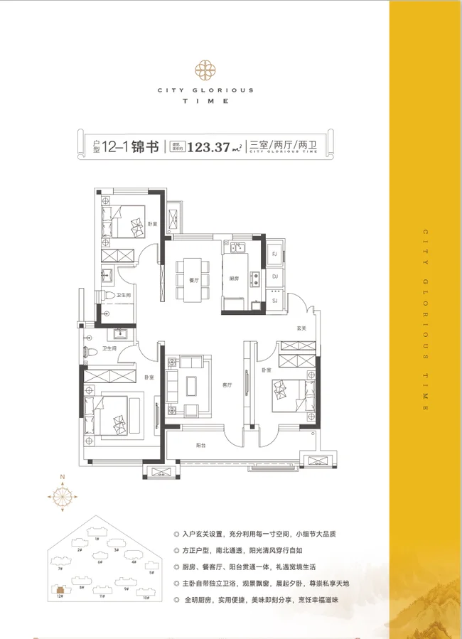 本次加推的7# 12#约123㎡/130㎡/144㎡/169㎡的三室四室空间,南向超大面宽,阳光清风不请自来;一体化餐、客、阳台,实现了空间最大化利用,待客聚会从容有余;超大面积套房式主卧,彰显主人尊崇身份,更配有270°景观、双联阳台等产品细节,刻画家的美好,提升空间品质感。
