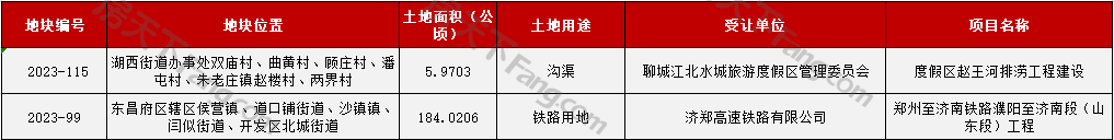 2023年9月聊城城区共划拨2块,189.9909公顷,1宗为沟渠,1宗为铁路用地。