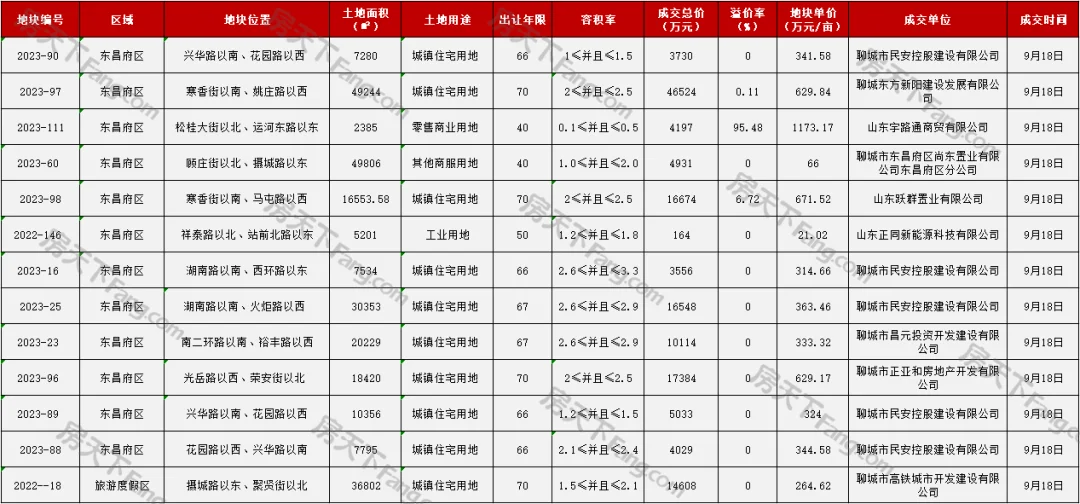 2023年9月城区共成交13块,261958.58㎡,成交金额147492万元!