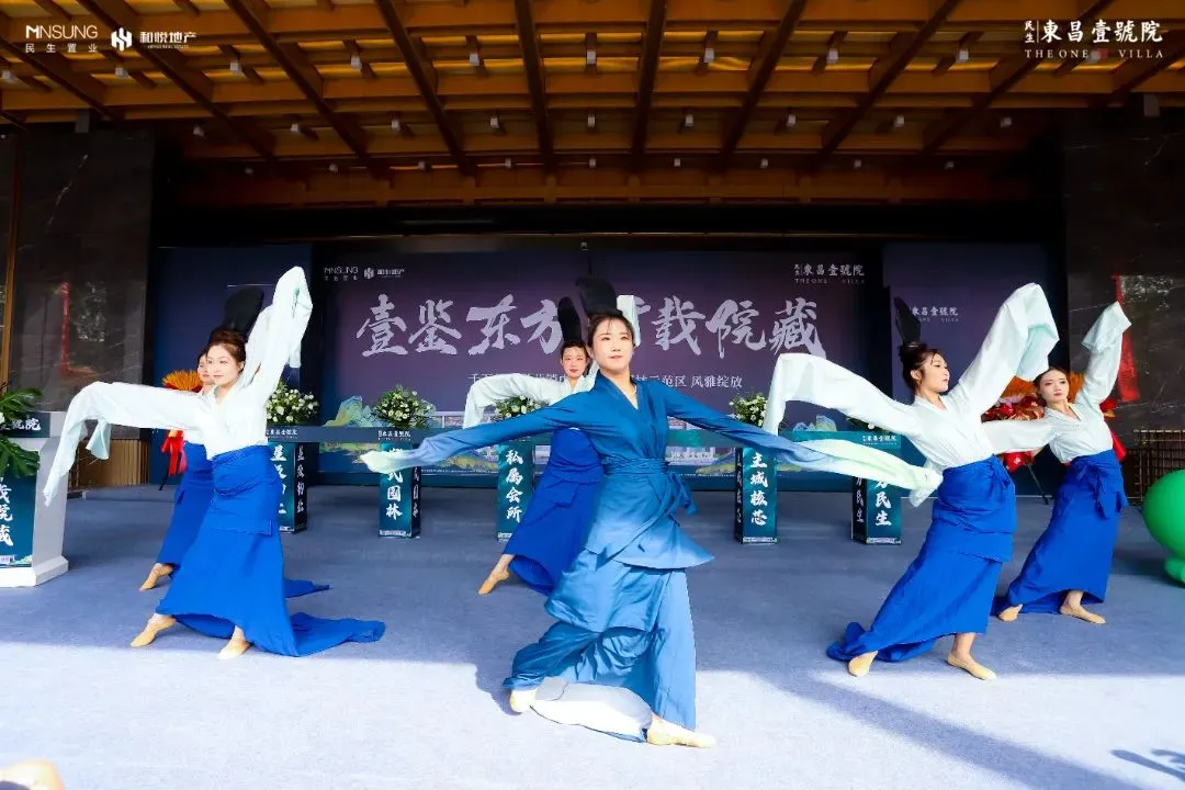 惊鸿一现即惊艳。上午11:00点,民生·东昌壹號院营销中心前宾客络绎不绝。一场《只此青绿》的舞蹈巡演,以舞为笔,绘出了中国十大传世名画《千里江山图》之美,让在场的嘉宾宛若进入了作者王希孟的传世长卷。
