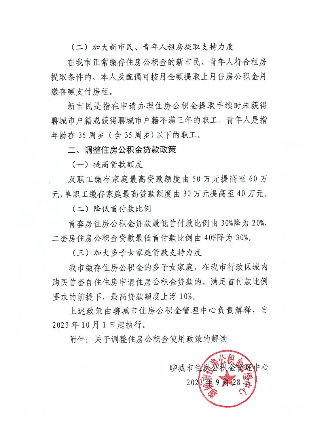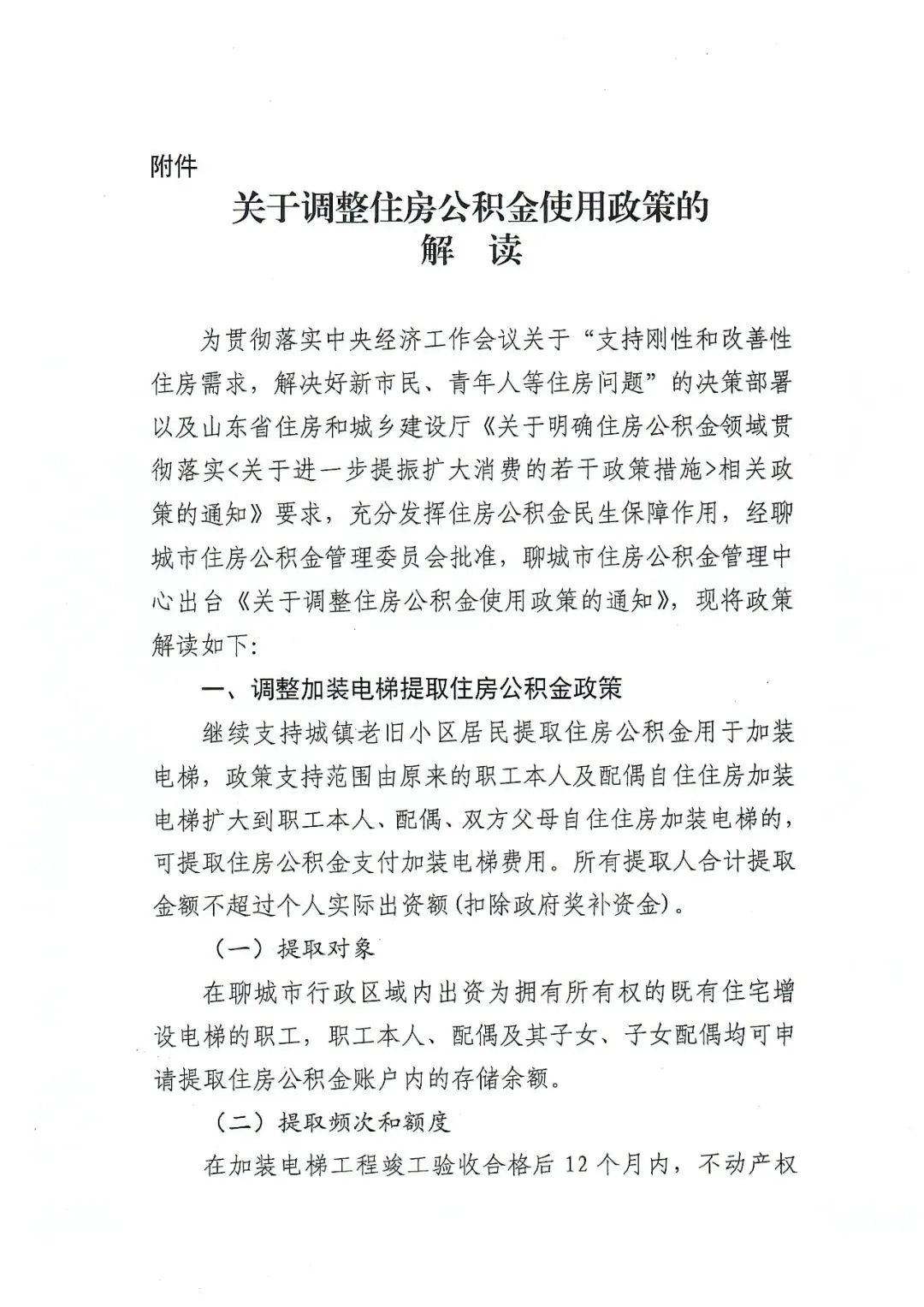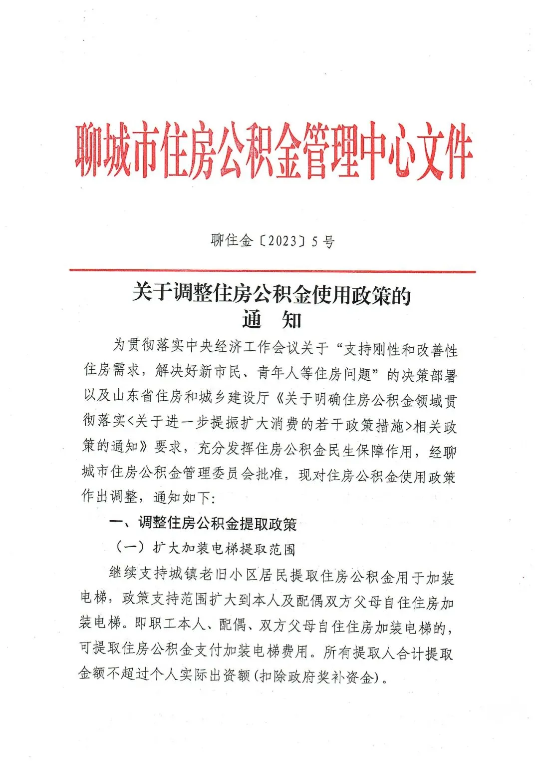 为贯彻落实中央经济工作会议关于“支持刚性和需求,解决好、青年人等住房问题”的决策部署以及山东省住房和城乡建设厅《关于明确住房公积金领域贯彻落实<关于进一步提振扩大消费的若干政策措施>相关政策的通知》要求,充分发挥住房公积金民生保障作用,经聊城市住房公积金管理委员会批准,现对住房公积金使用政策作出调整,通知如下: