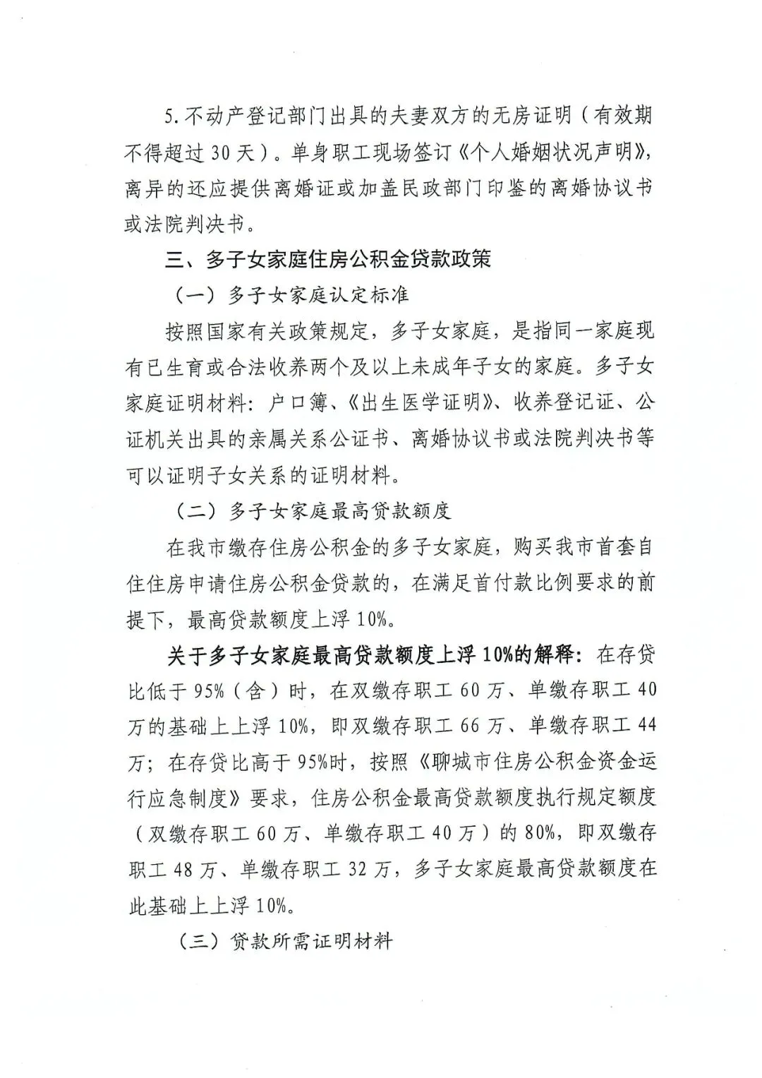 关于多子女家庭最高贷款额度上浮10%的解释:在存贷比低于95%(含)时,在双缴存职工60万/单缴存职工40万的基础上上浮10%,即双缴存职工66万、单缴存职工 44万;在存贷比高于95%时,按照《聊城市住房公积金资金运行应急制度》要求,住房公积金最高贷款额度执行规定额度(双缴存职工60万、单缴存职工40万)的80%,即双缴存职工 48万、单缴存职工32万,多子女家庭最高贷款额度在此基础上上浮 10%。