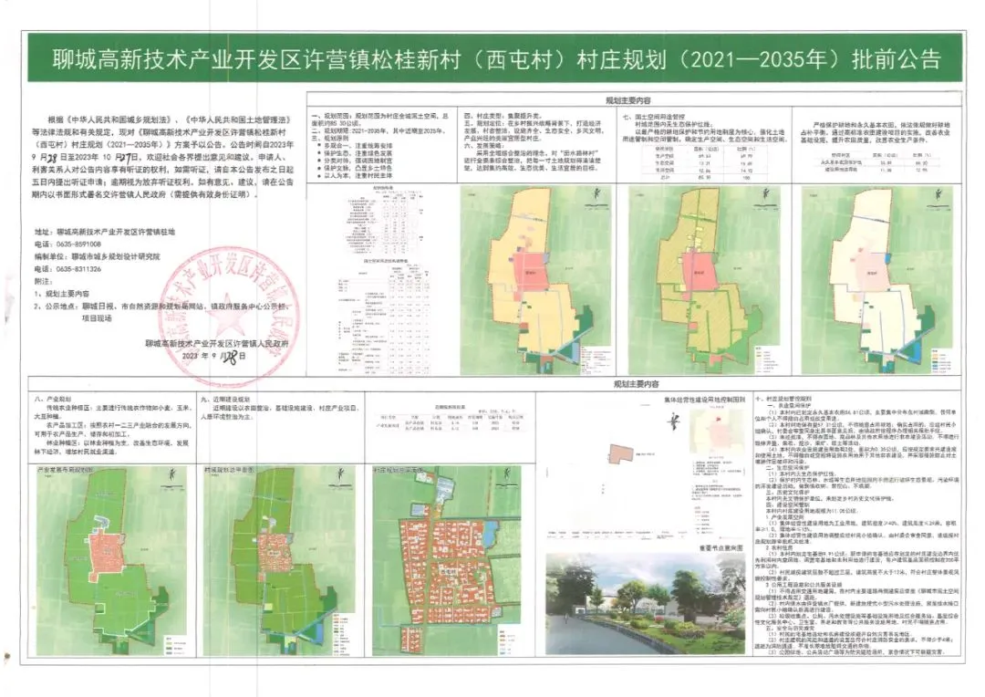 根据《中华人民共和国城乡规划法》、《中华人民共和国土地管理法》等法律法规和有关规定,现对《聊城许营镇松桂新村(西屯村)村庄规划(2021-2035年)》方案予以公告。公告时间自2023年9月28日至2023年10月27日,欢迎社会各界提出意见和建议。申请人、利害关系人对公告内容享有听证的权利,如需听证,请自本公告发布之日起五日内提出听证申请:这期视为放弃听证权利。如有意见、建议,请在公告期内以书面形式暑名文许营镇人民政府(需提供有效身份证明)。