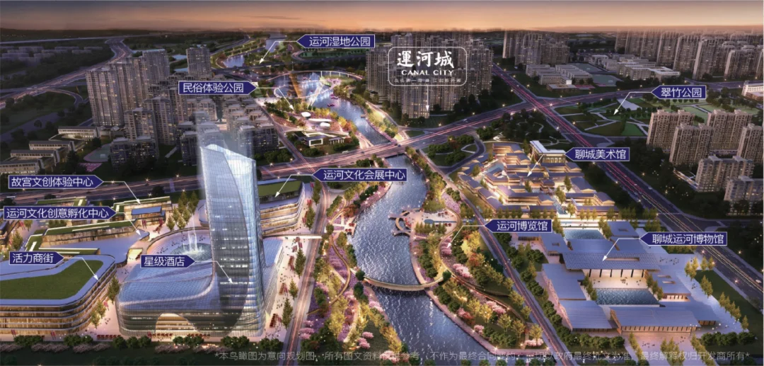 运河城直面京杭运河数万平米水域,运河景观公园、聊城美术馆、翠竹公园以及运河博览园等休闲娱乐等场所形成历史文化与现代文明交融的新格局;整个项目被包裹其中。