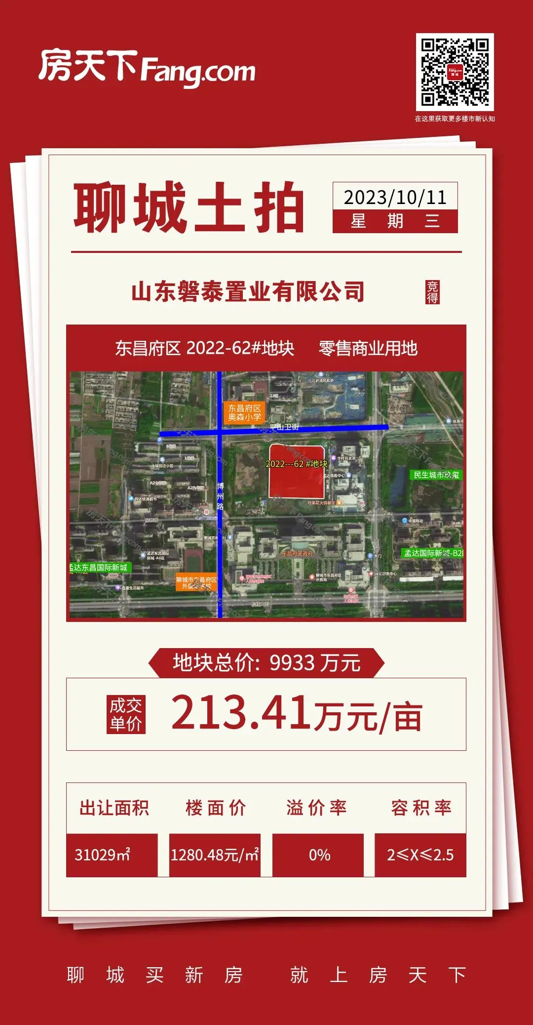 竞得单位:山东磐泰置业有限公司成交总价:9933万元亩单价:213.41万/亩