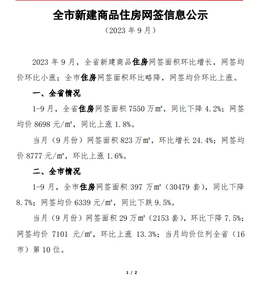2023 年 9 月,全省新建面积环比增长,网签环比小涨;全市住房网签面积环比略降,网签均价环比上涨。