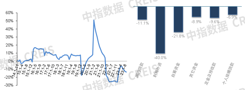 图:2014年至今全国房企到位资金同比增速及2023年前三季度各项资金来源同比增速对比