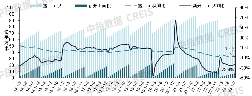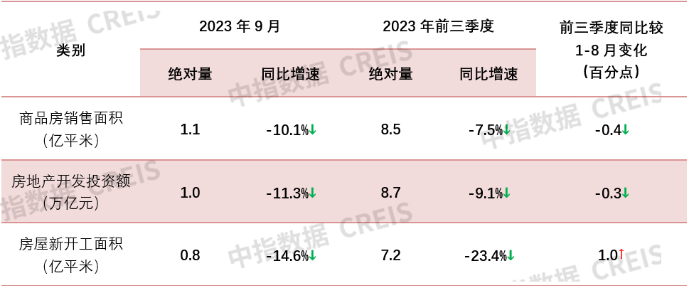:2023年前三季度,全国为7.2亿平方米,同比下降23.4%,降幅较1-8月收窄1.0个百分点;9月单月,全国约为0.8亿平方米,同比下降14.6%,较上月降幅收窄8.9个百分点。其中,前三季度新开工面积为5.3亿平方米,同比下降23.9%。