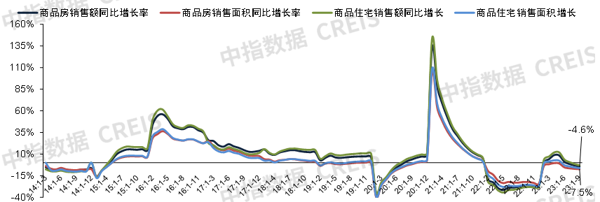 图:2014年至今全国商品房和累计销售面积以及销售额同比增速