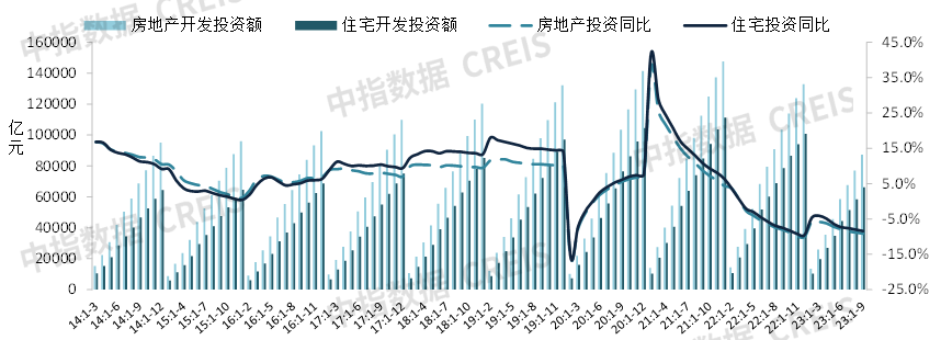 额:2023年前三季度,全国额为8.7万亿元,同比下降9.1%,降幅较1-8月扩大0.3个百分点;9月单月,全国额为1.0万亿元,同比下降11.3%,较上月降幅扩大0.3个百分点。其中,前三季度开发投资额为6.6万亿元,同比下降8.4%,占房地产开发投资比重为75.9%。