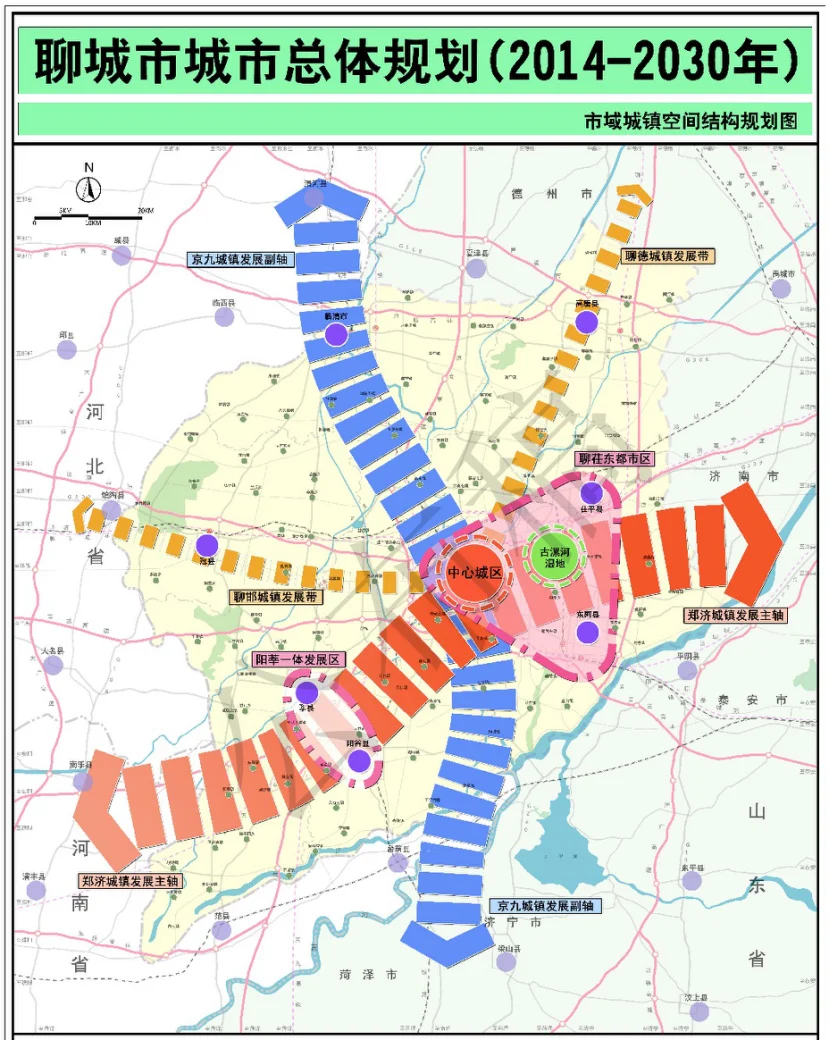 按照《聊城市城市总体规划(2014-2030年)》,为优化城市发展空间,聊城城市发展确定为“一主、两副、三轴、五片”的城市空间结构。“五片”即五个综合性城市片区,分别为中心生活服务区、北部工贸物流区、西部高铁新城、南部旅游商贸区、产城新区。