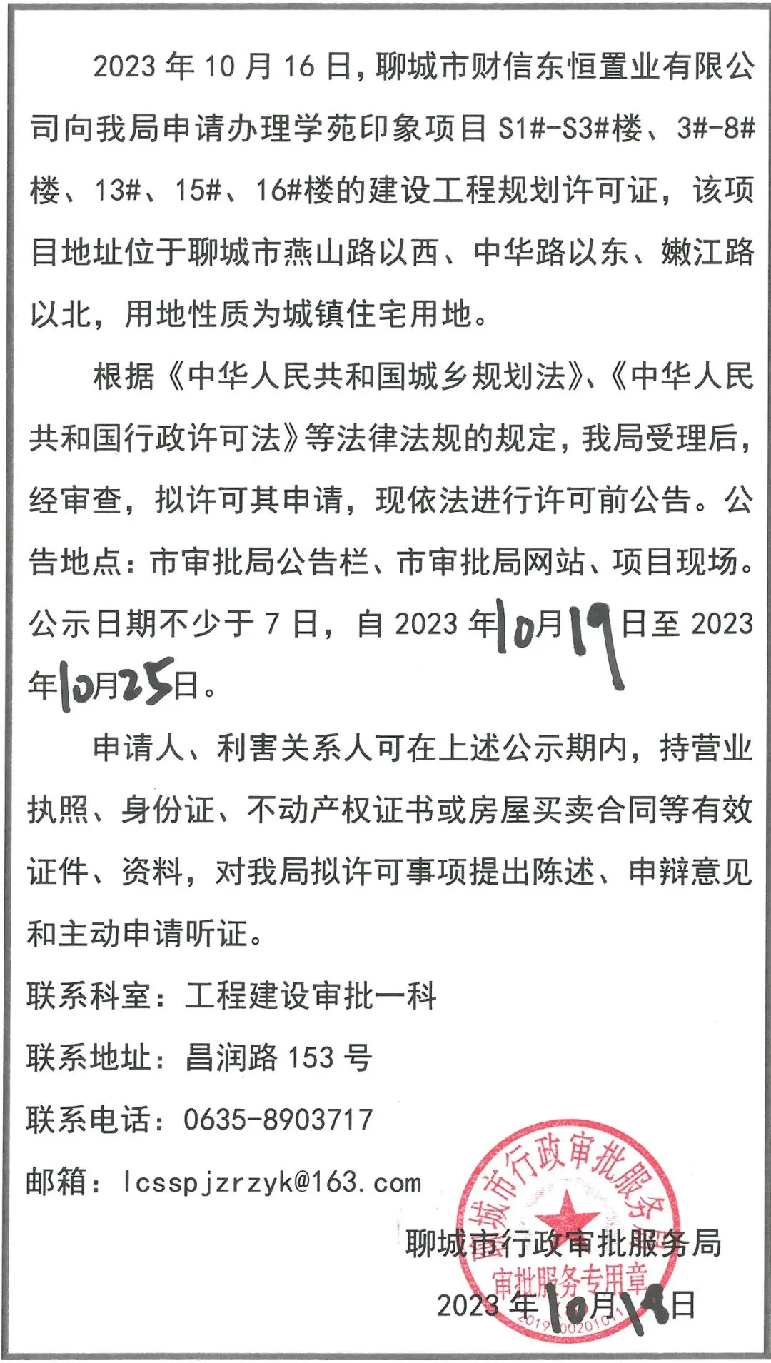 关于聊城市财信东恒置业有限公司的学苑印象-s1#-s3#、3#-8#、13#-16#楼的许可前公告