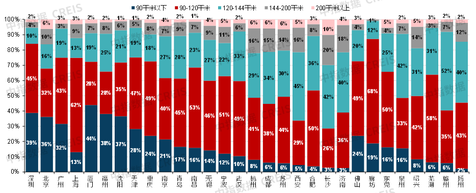 图:2023年1-9月30个代表城市各面积段住宅销售套数占比