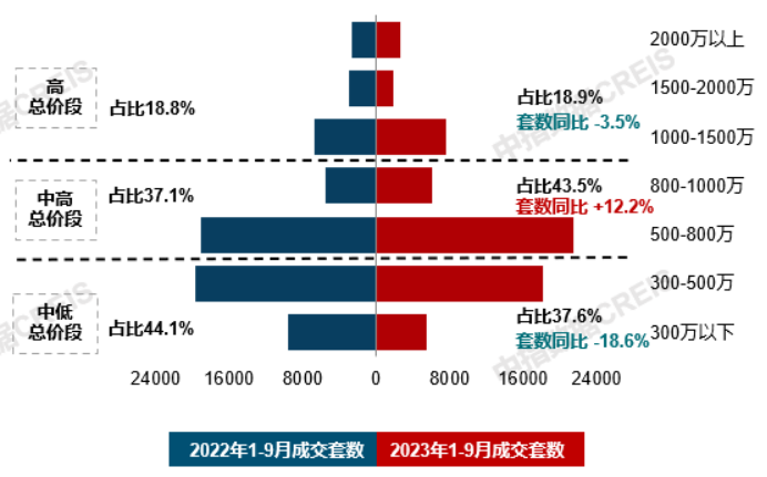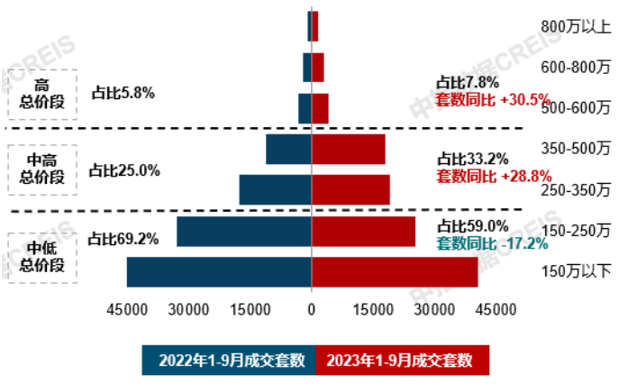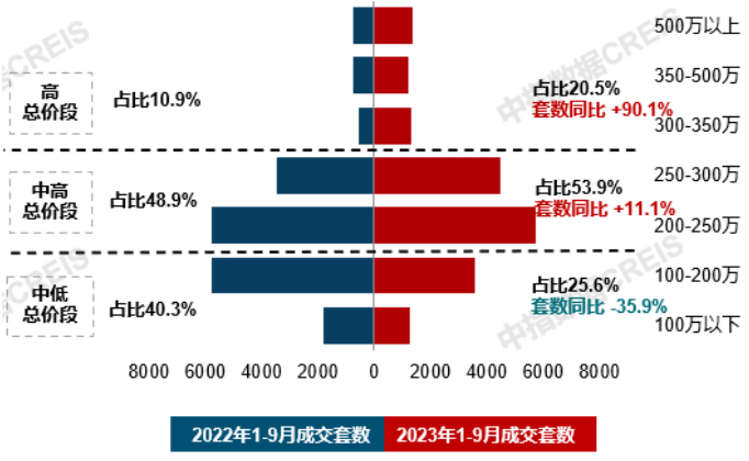 从成交总价结构看,250万以下产品成交套数占比59.0%,较2022年同期下降10.2个百分点。250-500万产品成交套数占比33.2%,较2022年同期提升8.2个百分点。500万以上产品成交套数占提升至7.8%。