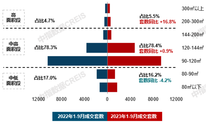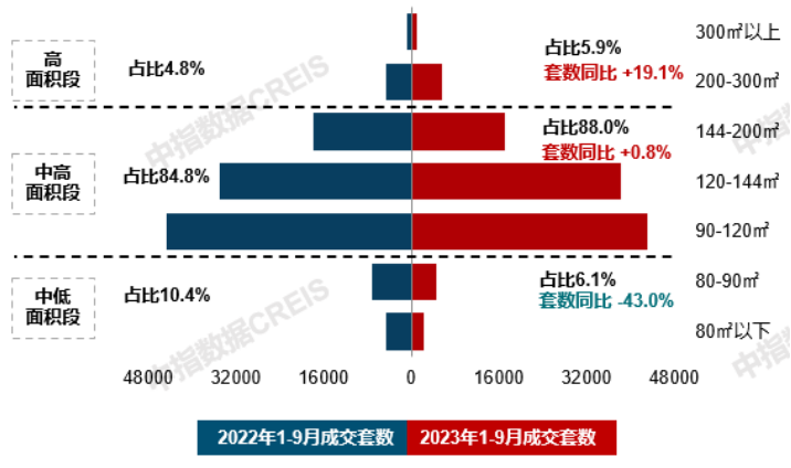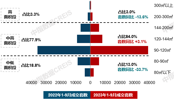 从成交套数占比变化上看,与2022年1-9月相比,2023年1-9月30个代表城市中,16个城市90平以下产品成交套数占比下降;17个城市120平以上产品成交套数占比上升,其中一为13个;在120平以上面积段中,20个城市120-144平面积段产品成交套数占比提升。