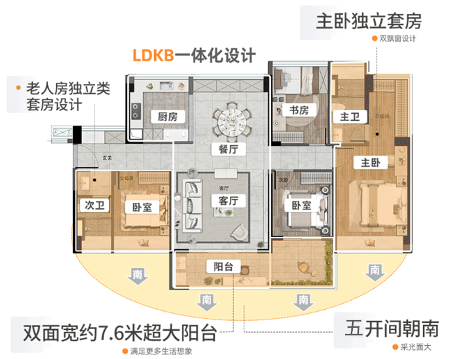 户型设计上,143平户型一梯一户设计,独立电梯厅。四面朝南,面宽约13.75米,阔绰四室空间布局,让每个家庭成员都有自己独立空间,满足私密所需。ldkb联动空间搭配南向7米阳台,并配备大面积落地玻璃窗,最大化将阳光载入室内。室内采取可变空间设计,伴随家庭的成长,可将书房与客厅打通或封闭,以满足更多元的使用场景。